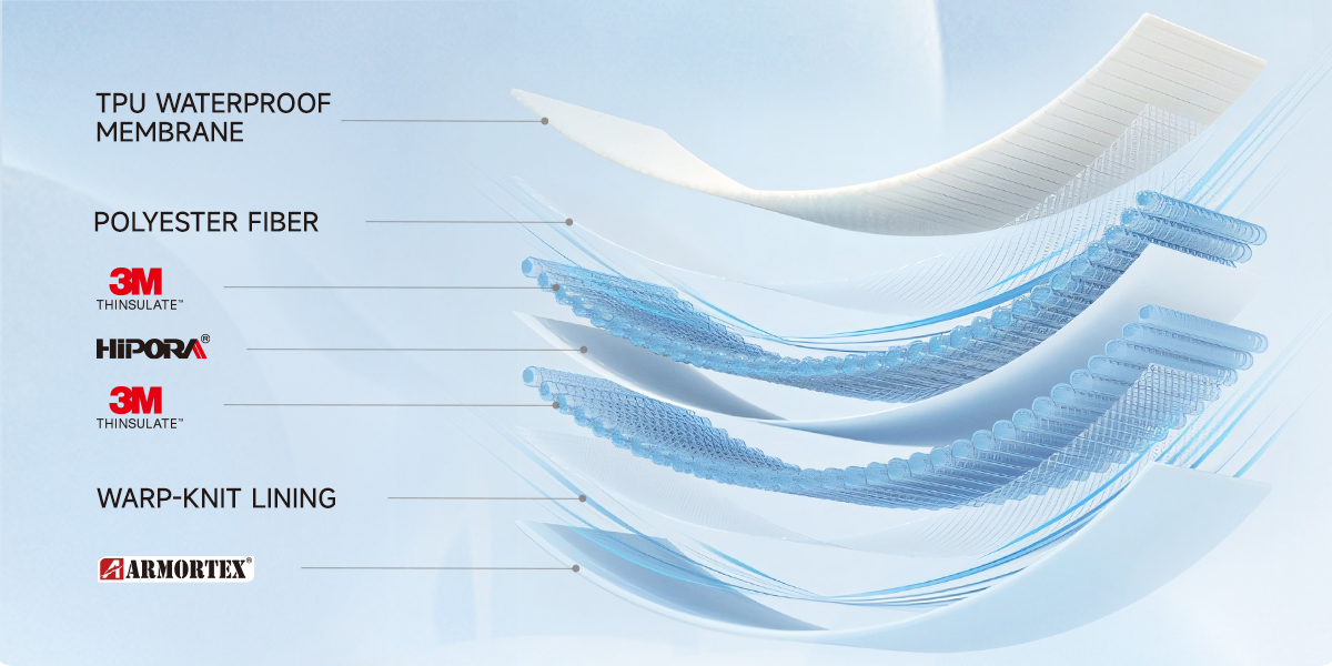 A three-layer, microporous PU membrane engineered for gloves: it stops external water, lets sweat vapor out, and forms a windproof barrier to help keep hands comfortable in cold, damp weather. Widely used as an internal glove insert for winter and snow sports.